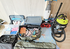 장비와 소모품들을 잘 정리정돈해서 깔끔하게 청소를 진행하는 모습이 보기 좋았습니다.