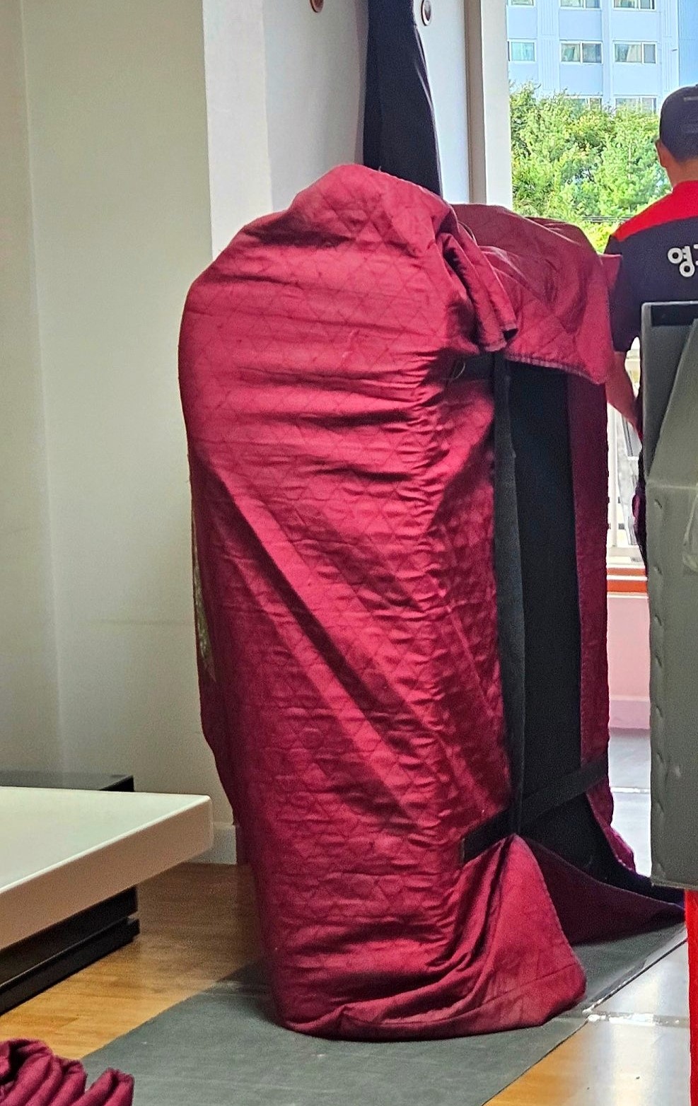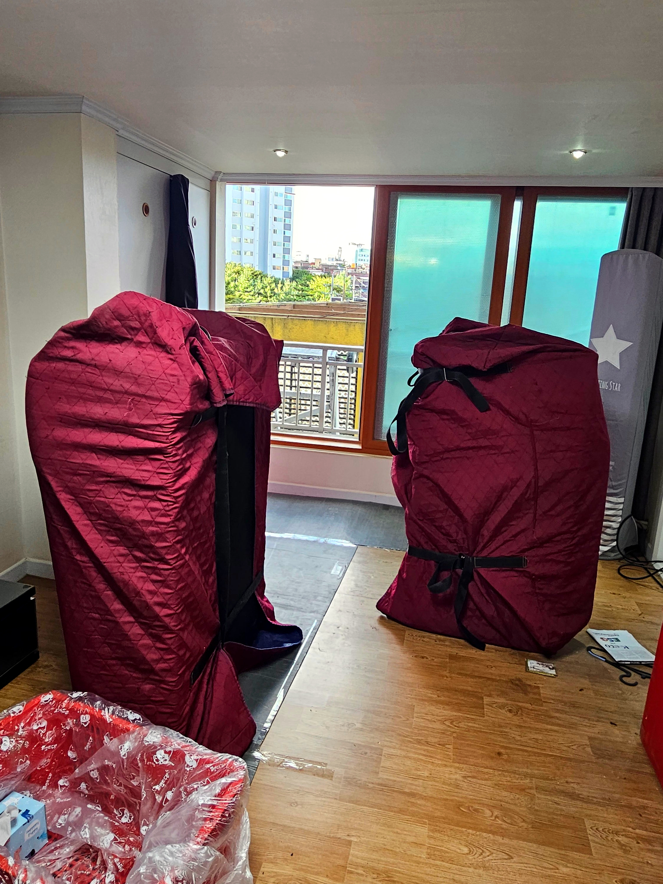 거실창을 거실 한 켠에 잠시 둘 때도 벽에 혹시나 자국은 생기지 않을지 보시고, 자국이 생길수도 있을것을 염려하시어, 뒤에 두꺼운 것을 덧대어 두시고 세워두시는 세심함에 감동!