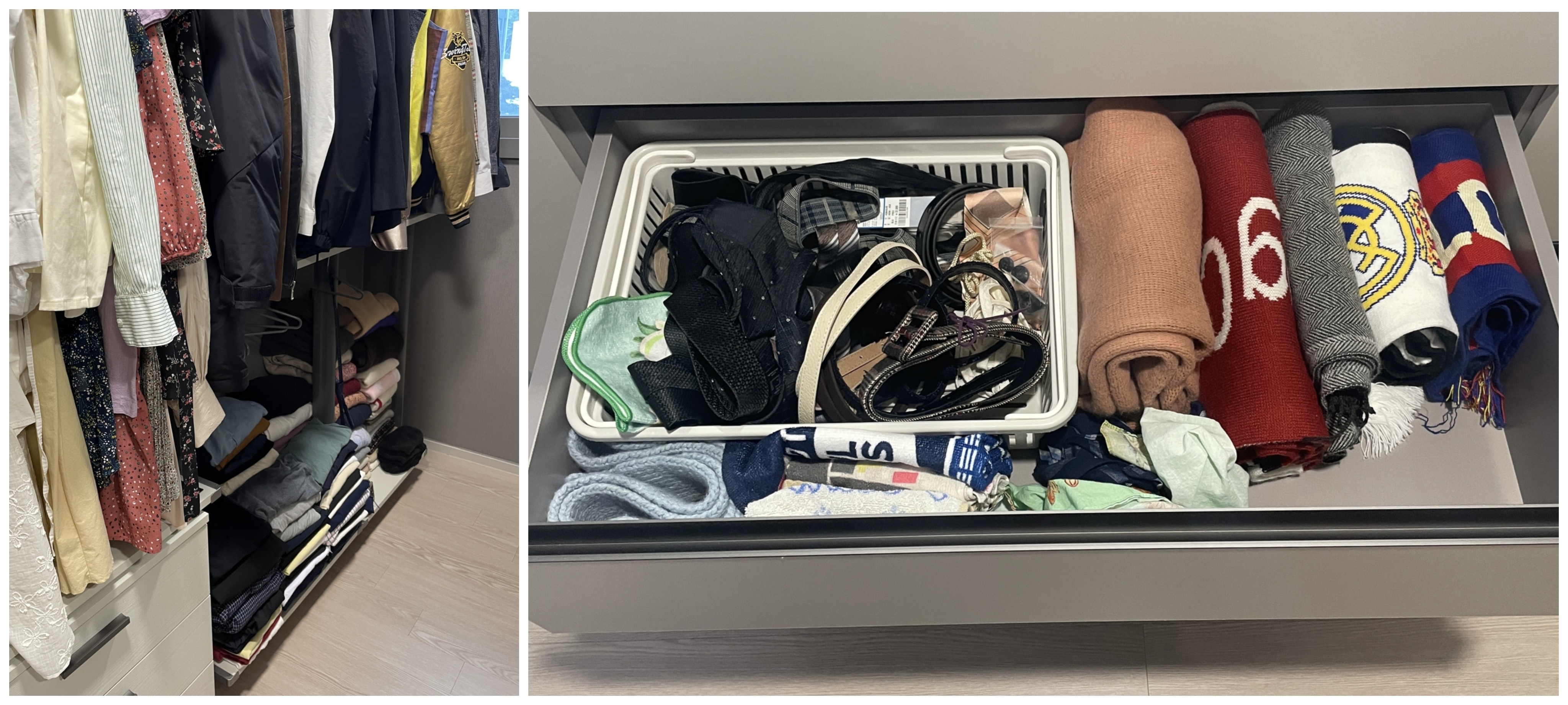 주방을 보다가 드레스룸에 들어가 보니 어느새 옷장에는 옷이 전부 걸려있고, 모두 개어 차곡차곡 쌓아져 있어서 또 한 번 감탄했습니다. 수납장에는 잡화끼리 가지런히. 아저씨 직원분이신데도 저보다 옷을 섬세히 잘 개시는 모습이 배우고 싶을 정도로 정말 멋졌습니다.