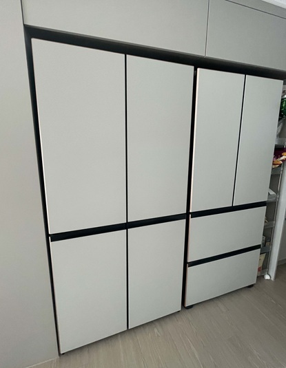 냉장고 두 대는 기존 집에서는 따로 두었는데 이번 집에서는 나란히 둘 수 있었어요! 문을 여닫는데 불편하지 않을지 간격, 수평까지 체크해 주시는 꼼꼼함 ㅎㅎ 그리고 식품을 넣기 전 내부도 잘 닦아 주셨어요! 센스 짱!