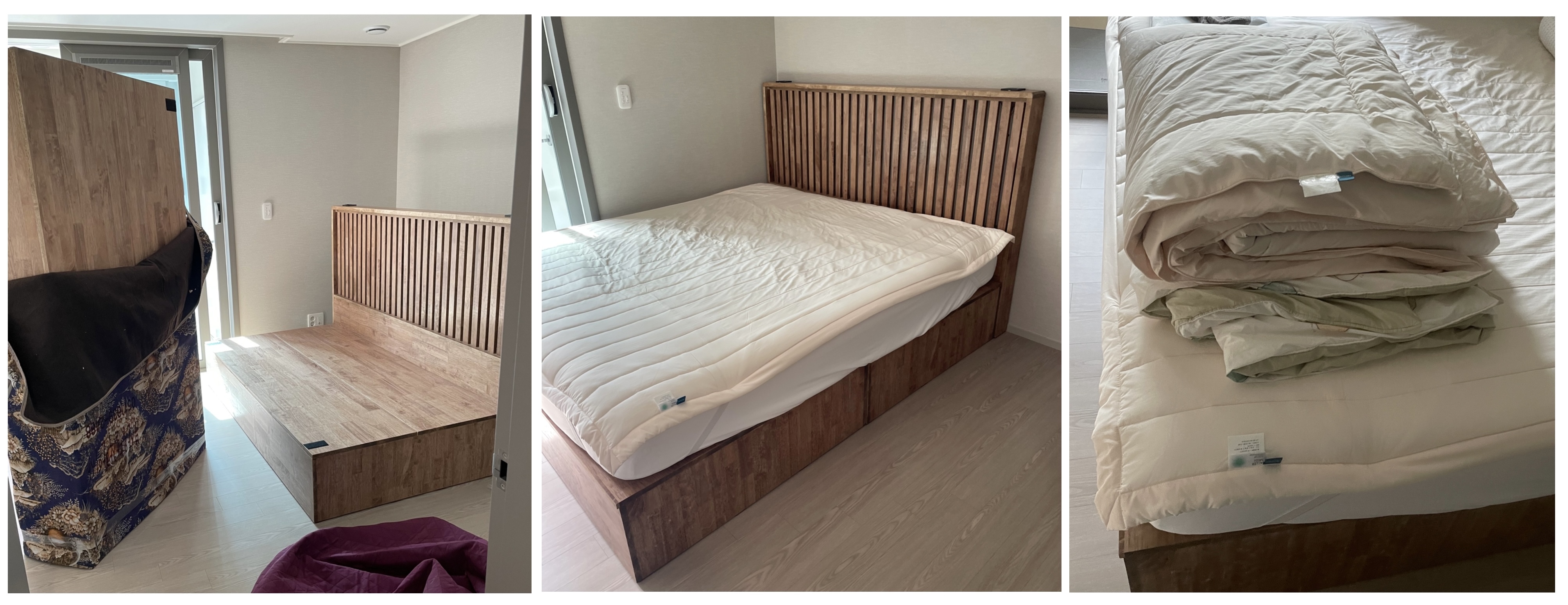 침대도 기스나 찍힘 없이, 매트리스도 새 비닐로 감싸 위생적으로 오염 없이 이사 완료 와우! 침대 프레임에 조명은 기존보다 더 깔끔하게 선들을 숨겨서 고정시켜 주셨습니다. 이불까지 가지런히 놔주셨어요!