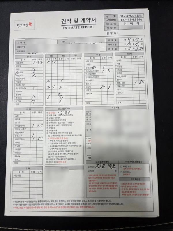 √ 본사 정책의 신뢰도 특히 영구크린은 *추가요금 발생 시 200% 본사 책임보상제*를 실시하고 있어서인지 견적을 정말로 꼼꼼하게 보시더라고요. 말로만 하는 약속이 아니라 본사의 정책을 현장에서도 성실하게 이행한다는 느낌을 받아 훨씬 안심이 되었습니다.