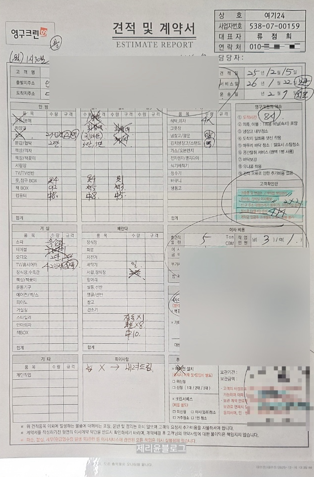영구크린405점 담당님께서 사다리차 비용, 짐 보관비용까지 상세히 설명해주셨다.