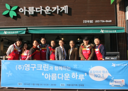 포장이사 전문기업 ㈜영구크린이 지난 19일 아름다운 가게(안국점)에서 ‘영구크린과 함께하는 아름다운 하루’ 행사를 개최했다. 아름다운 가게는 시민이 자발적으로 기증한 물품을 판매하고 이를 기부금으로 전환, 환원하는 비영리단체로써 영구크린과 ‘아름다운 이사캠페인’을 진행중인 곳이다.