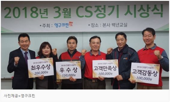 [동아닷컴] - 포장이사 전문기업 ㈜영구크린이 지난 21일, 강남구 삼성동 소재 본사에서 '18년 3월 CS정기시상식'을 진행했다. 영구이사는 매월 전국의 모든 지역점을 대상으로 서비스품질을 평가하고, 결과에 따른 시상을 진행하고 있다.