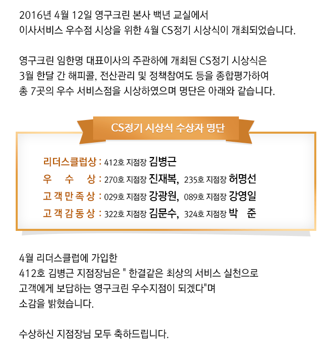 2016년 4월 CS정기 시상식 결과 안내