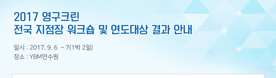 2017년도 (주)영구크린 전국 지점장 워크숍 및 연도대상이 경기도 화성시 YBM연수원에서 진행되었습니다.
