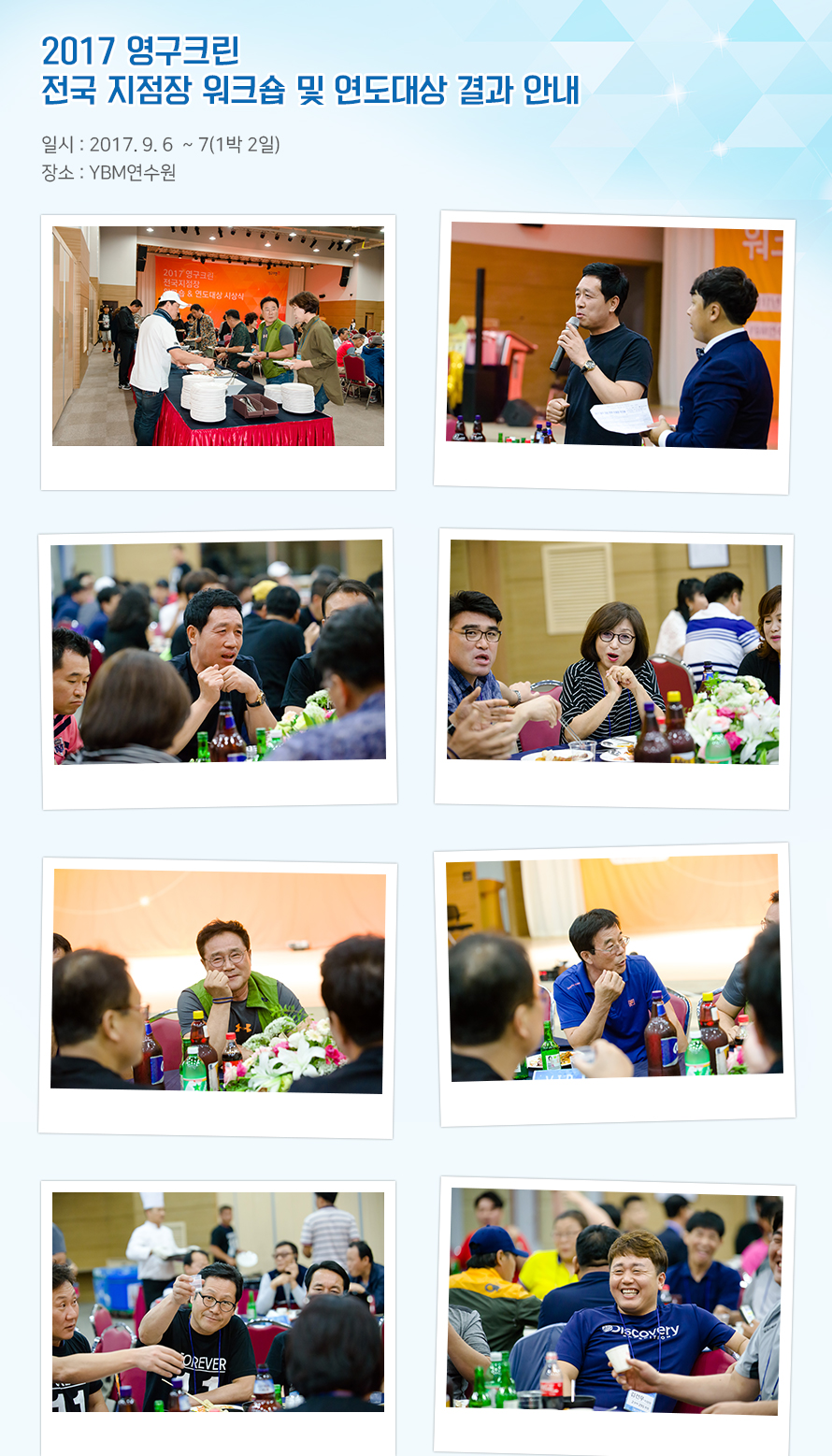 2017년도 (주)영구크린 전국 지점장 워크숍 및 연도대상이 경기도 화성시 YBM연수원에서 진행되었습니다.